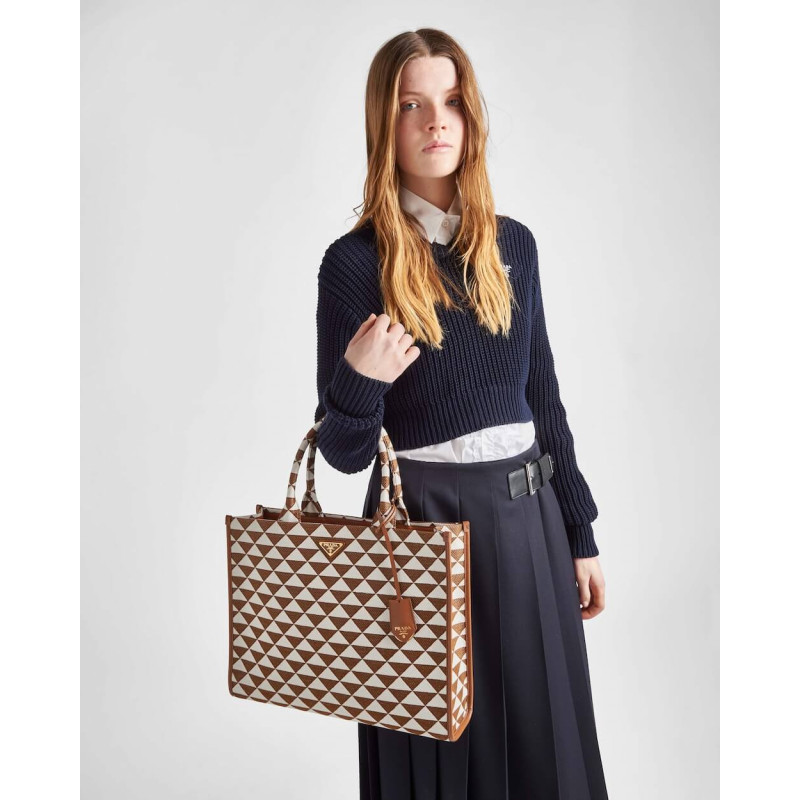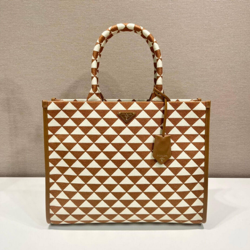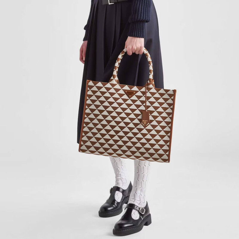 Introduced for the first time on trunks designed by Mario Prada, the Prada triangle expresses uniqueness and modernity through its universal, minimalist shape that is reinvented in a different way each season. Here, the geometric design is transformed into a sophisticated yet modernist pattern that plays with contrasting colors and decorates this sleek tote bag. Details in the brand s iconic Saffiano leather embellish the design.