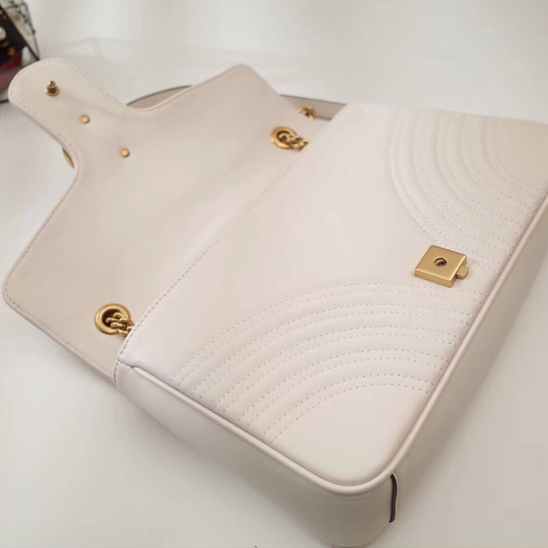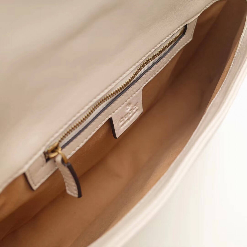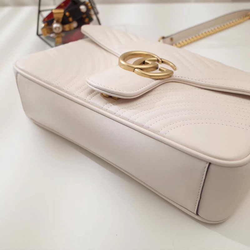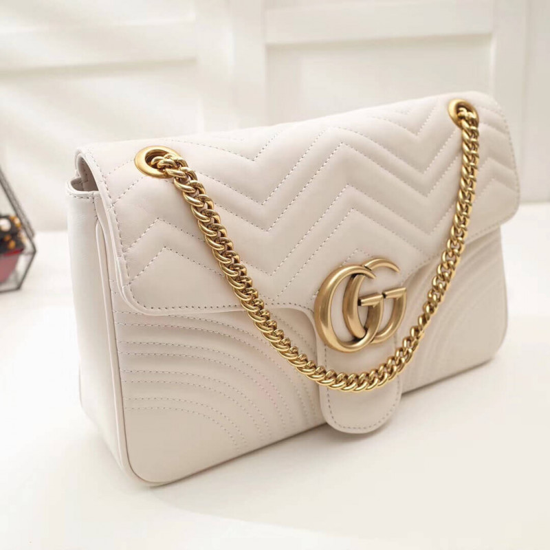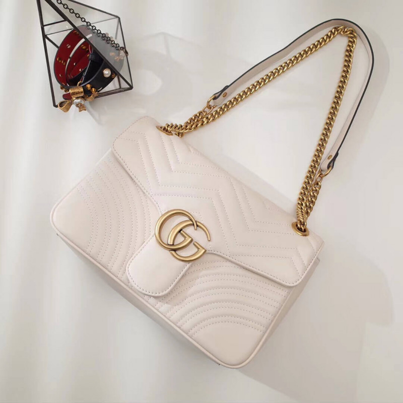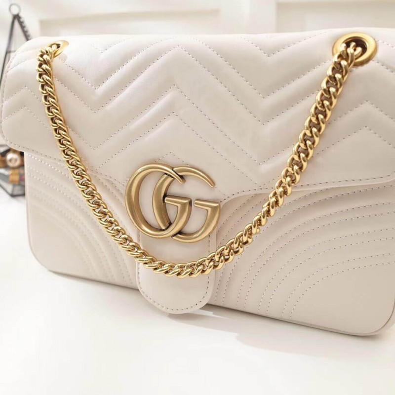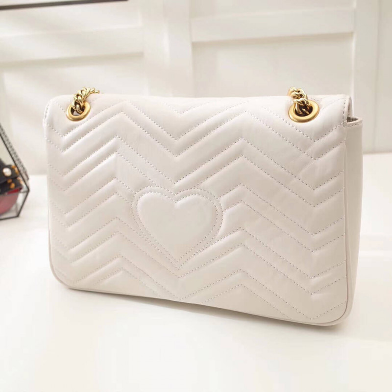 The medium GG Marmont chain shoulder bag has a softly structured shape and an oversized flap closure with Double G hardware. The sliding chain strap can be worn multiple ways, changing between a shoulder and a top handle bag. Made in matelassé chevron leather with a heart on the back.