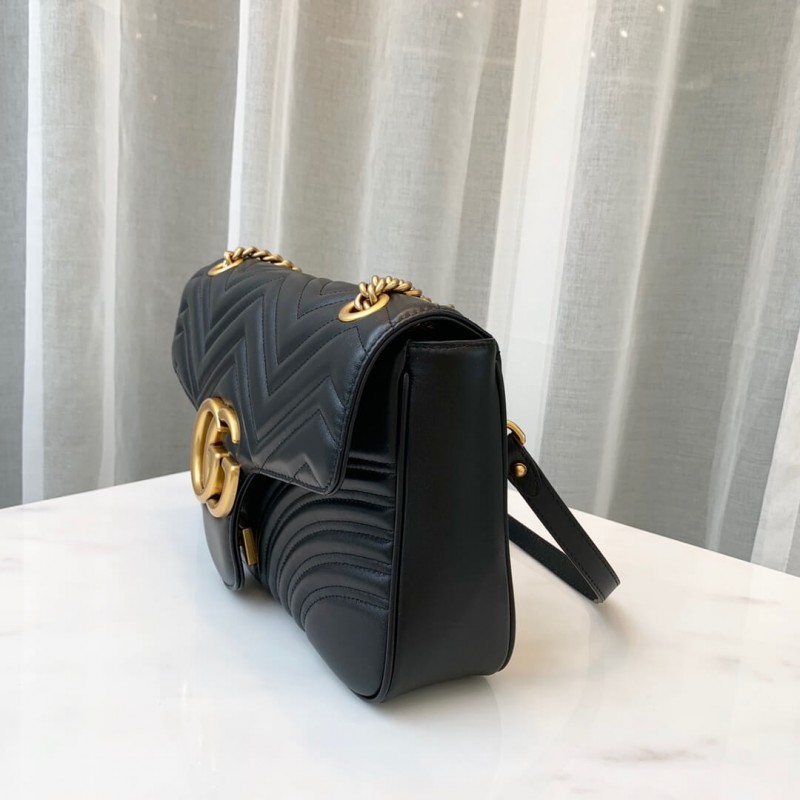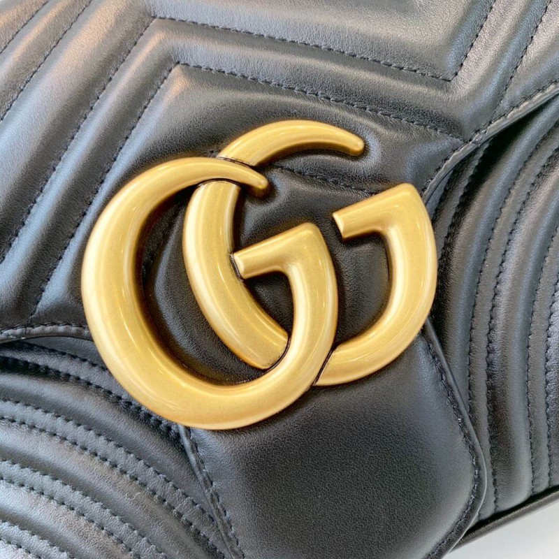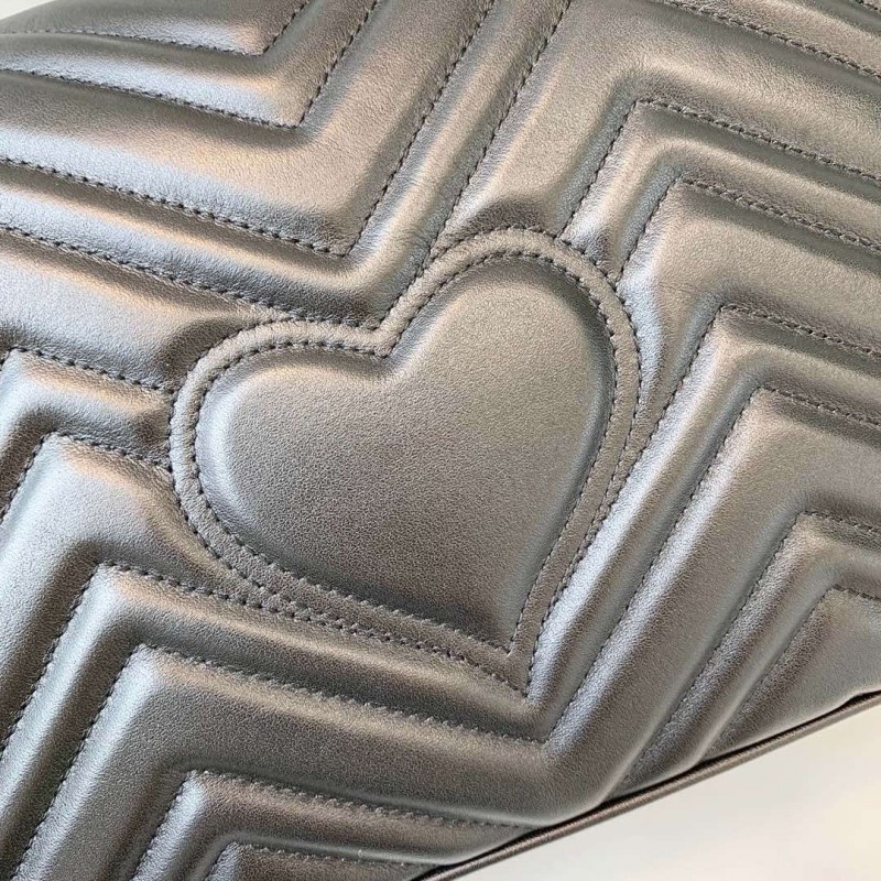 The medium GG Marmont chain shoulder bag has a softly structured shape and an oversized flap closure with Double G hardware. The sliding chain strap can be worn multiple ways, changing between a shoulder and a top handle bag. Made in matelassé chevron leather with a heart on the back.