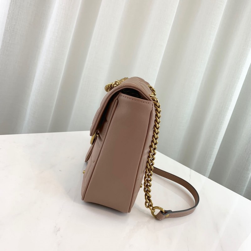 The medium GG Marmont chain shoulder bag has a softly structured shape and an oversized flap closure with Double G hardware. The sliding chain strap can be worn multiple ways, changing between a shoulder and a top handle bag. Made in matelassé chevron leather with a heart on the back.
