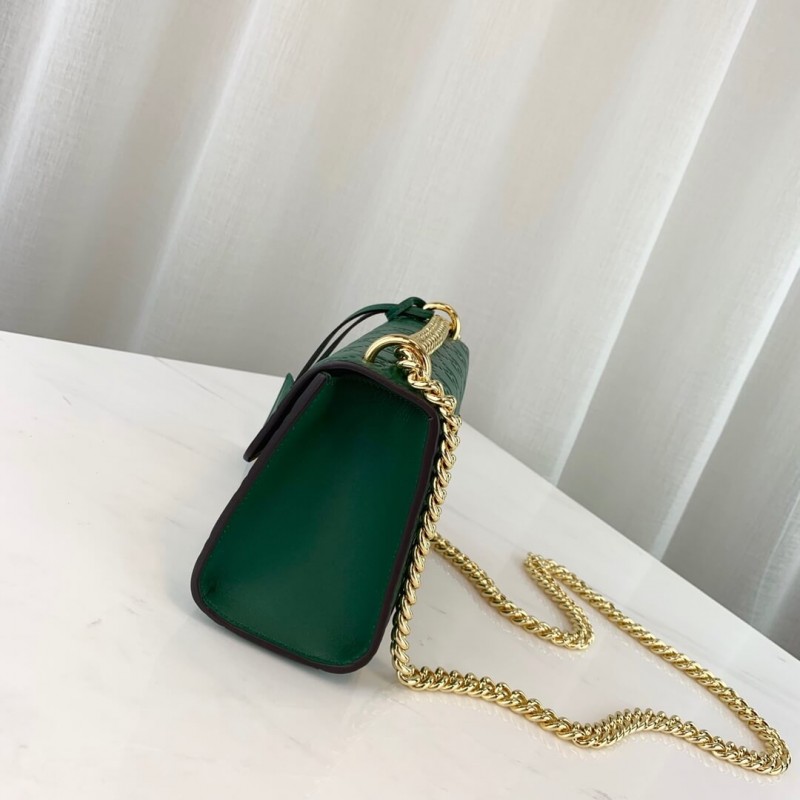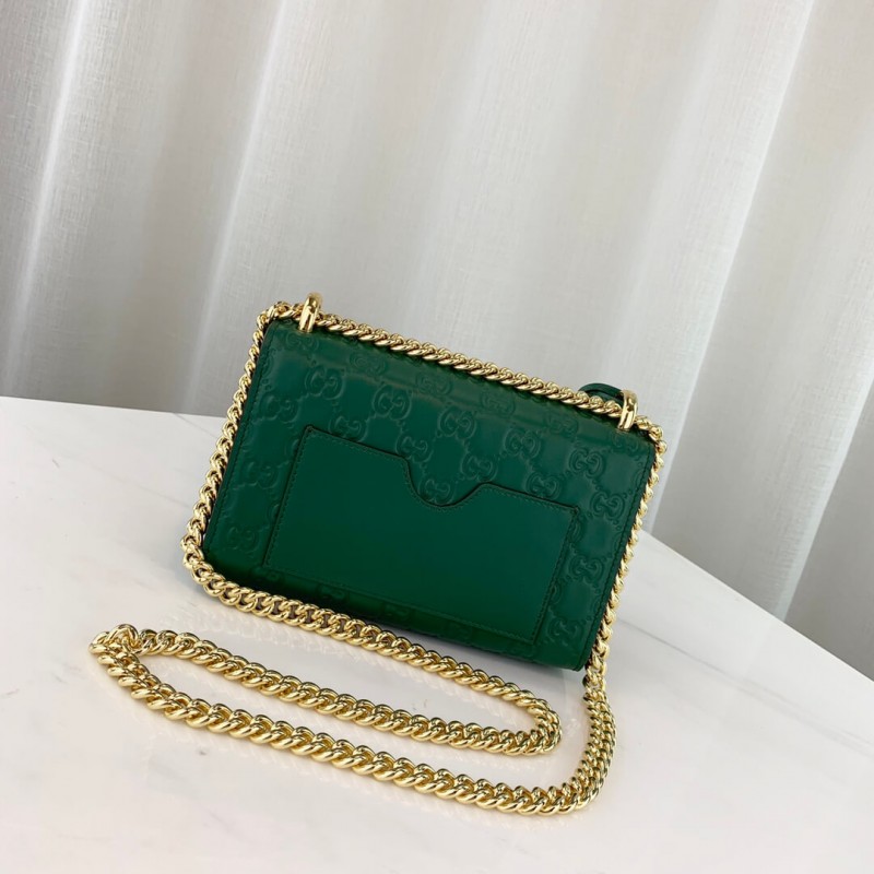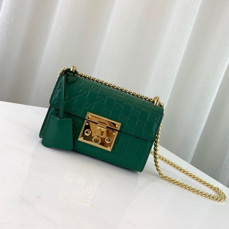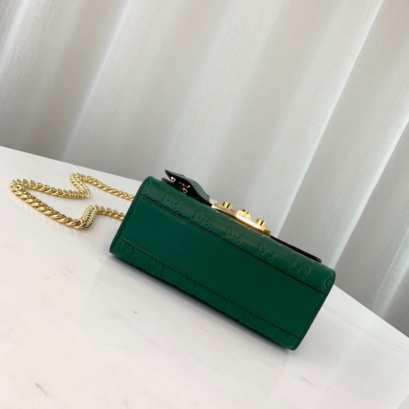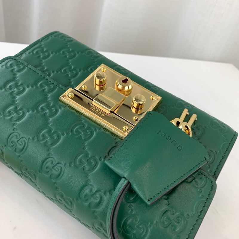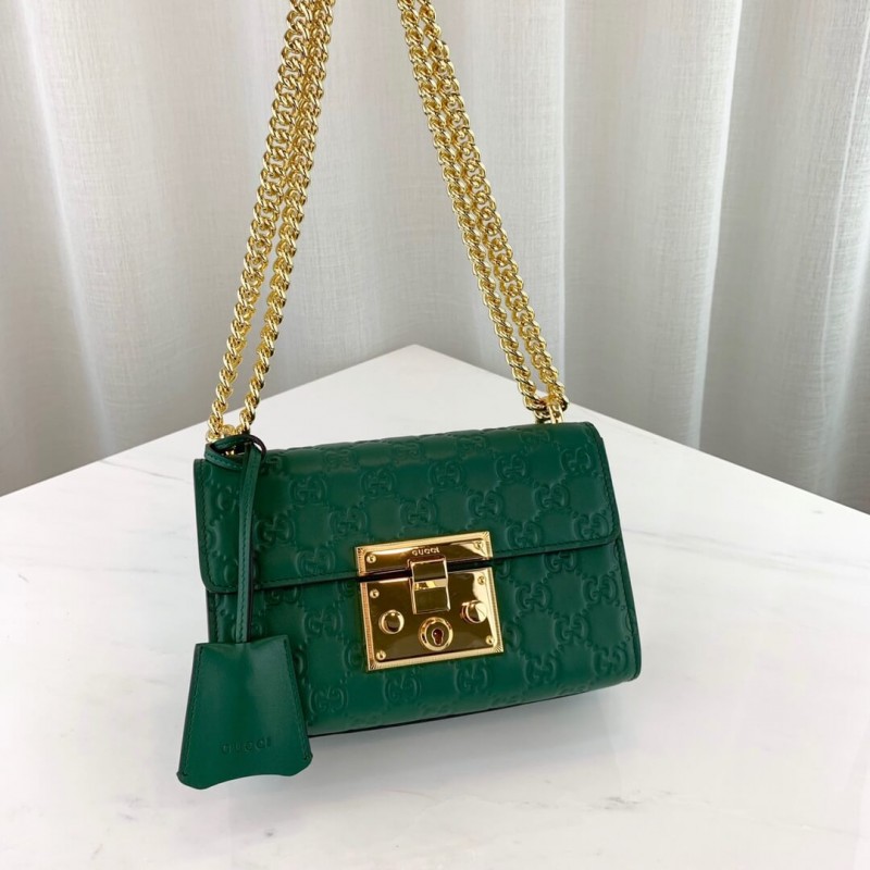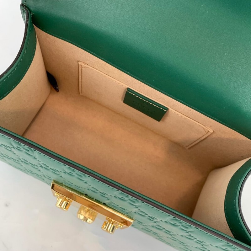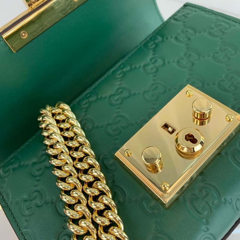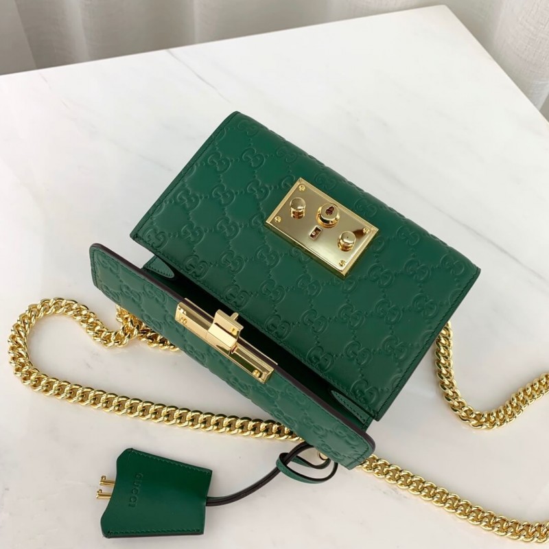 A small structured Gucci Signature leather bag with a key lock closure pulled from the archives, the key is placed in a leather key case that loops around the chain. The sliding chain strap can be worn multiple ways, changing between a shoulder and a top handle bag. Made in heat debossed Gucci Signature leather resulting in a defined print with a firm texture.