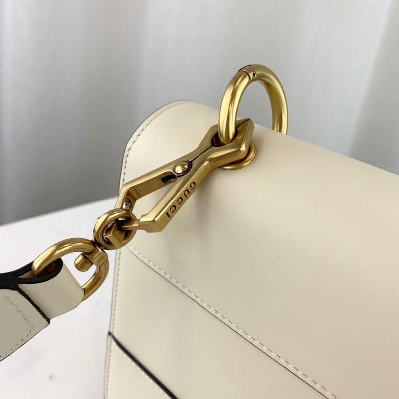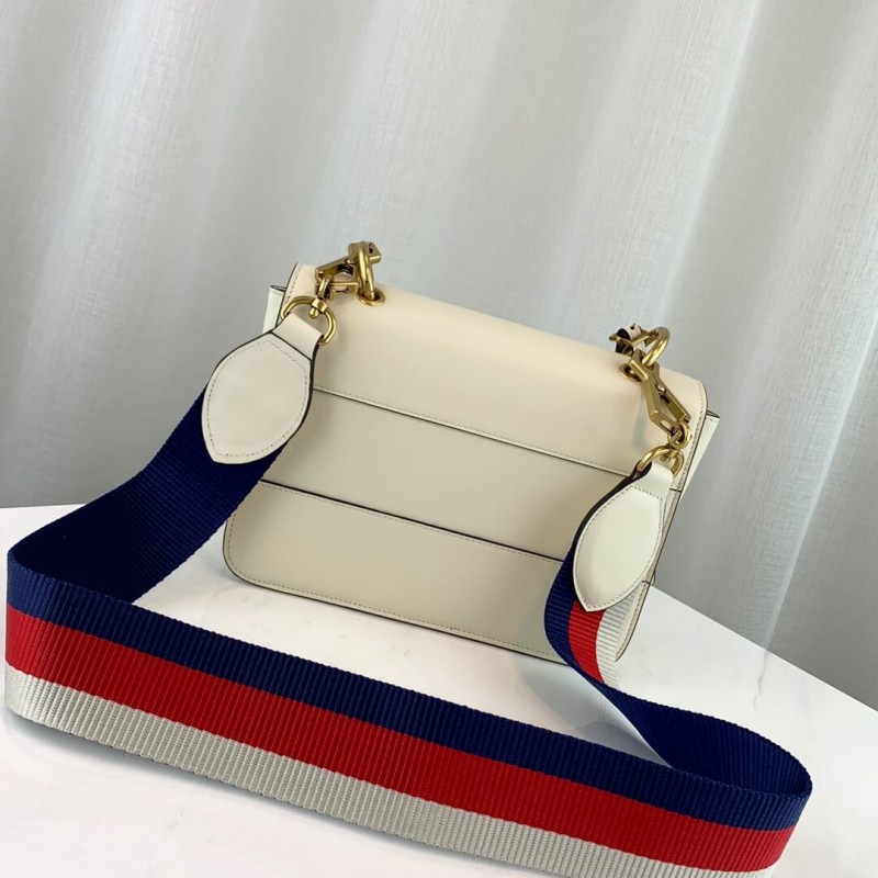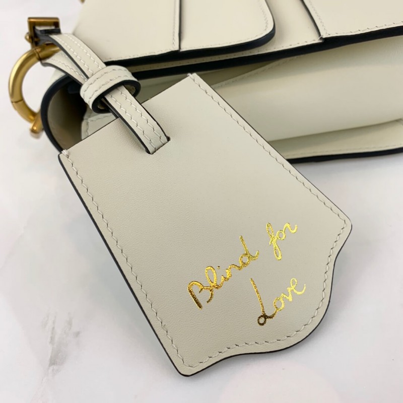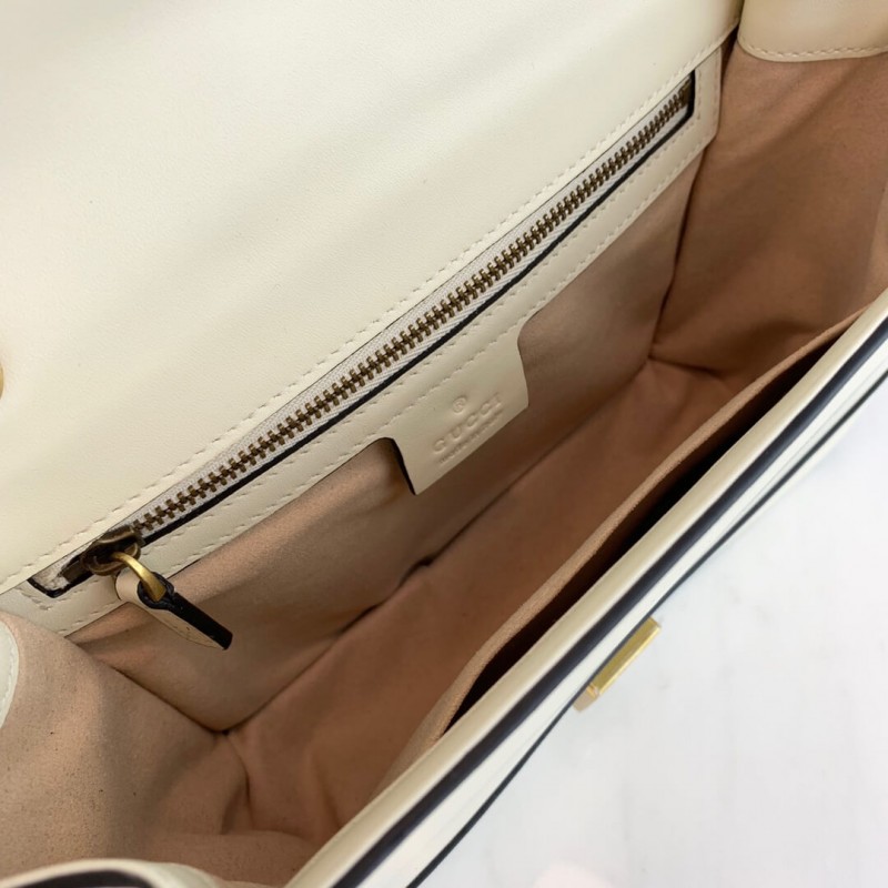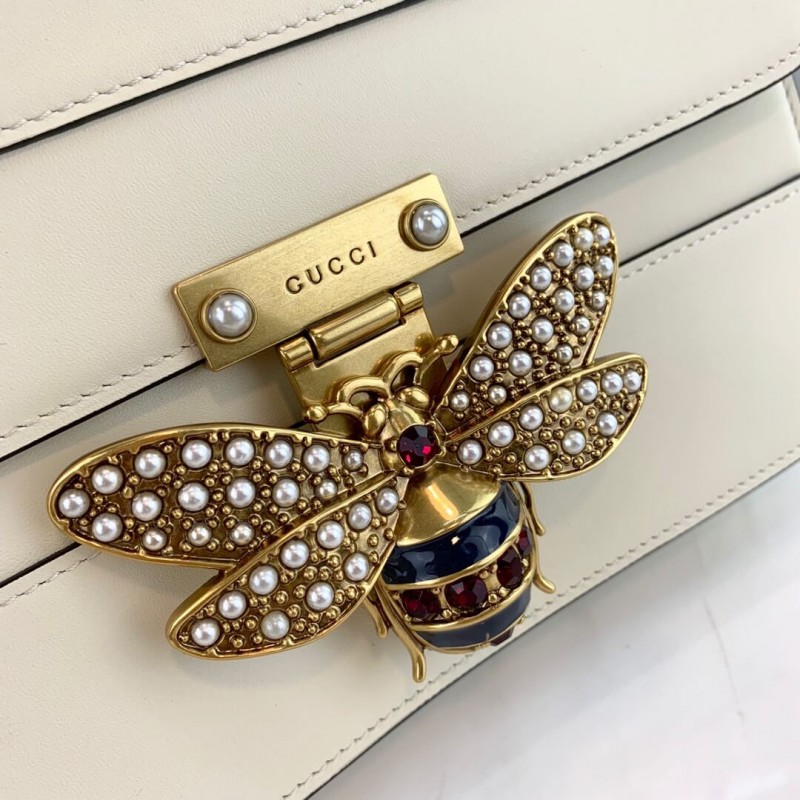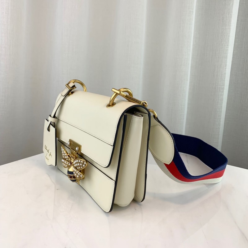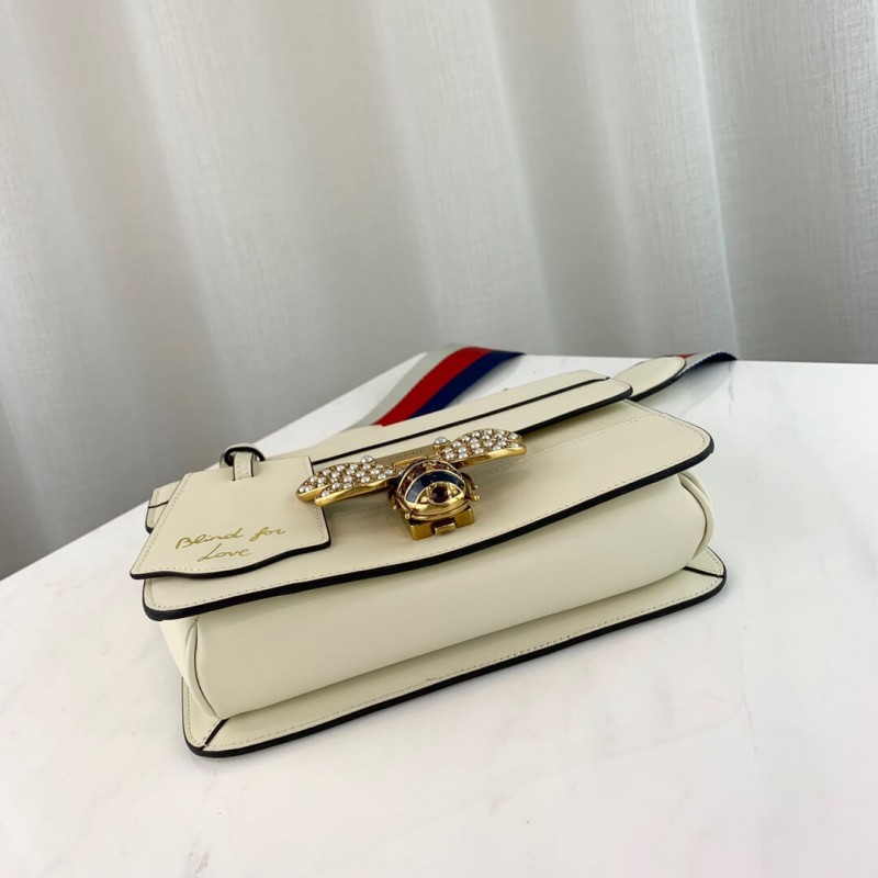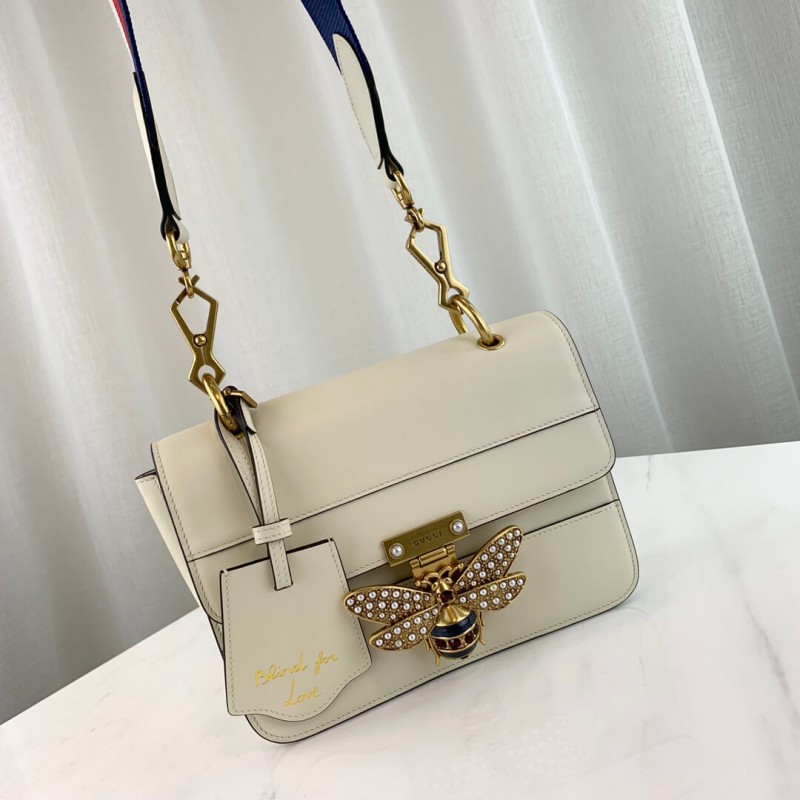 The Queen Margaret line mixes iconic Gucci details with newly established codes. The bee-a historical Gucci code taken from the 70s archives-is enriched by glass pearls and multicolor crystals. An ID holder with gold embossed "Blind For Love", a reference to inclusive romanticism, hangs over the top handle. Made in smooth leather with a slight shine in a color block design.