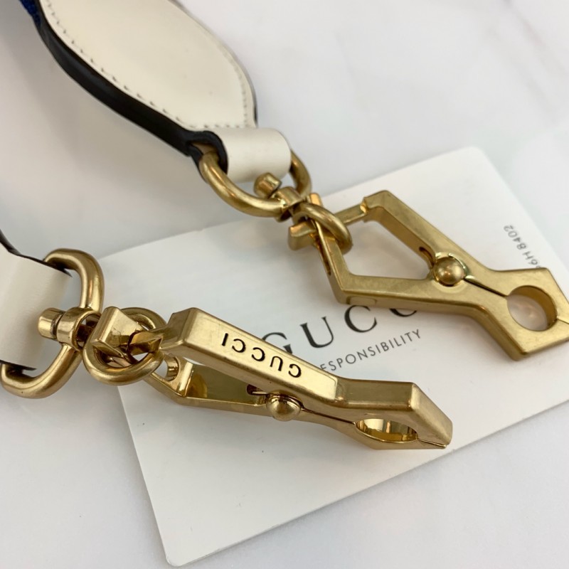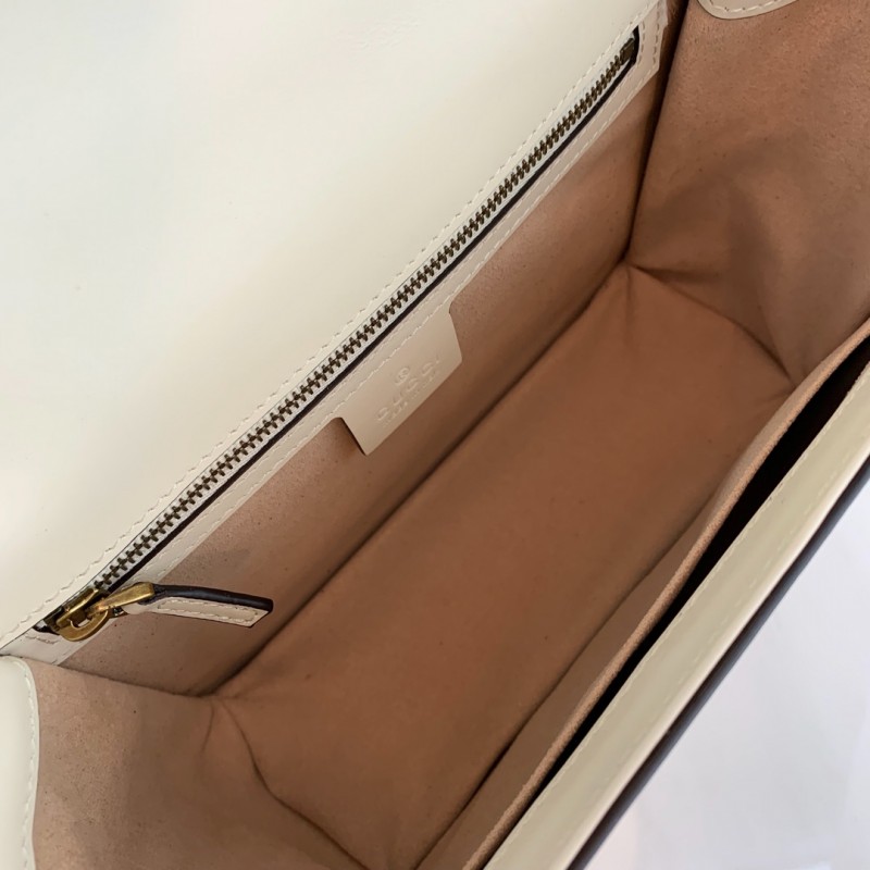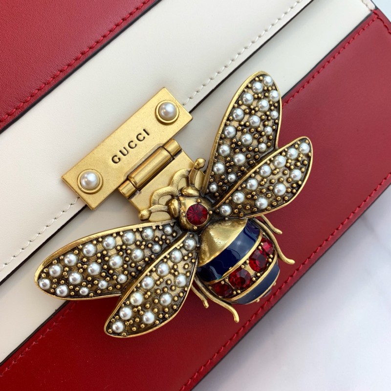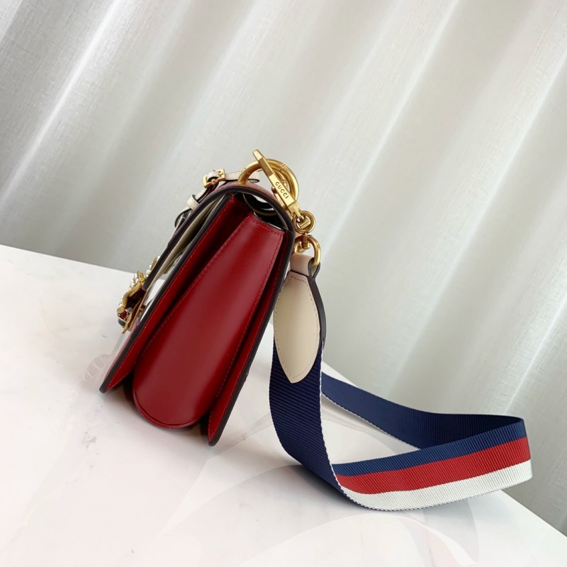 The Queen Margaret line mixes iconic Gucci details with newly established codes. The bee-a historical Gucci code taken from the 70s archives-is enriched by glass pearls and multicolor crystals. An ID holder with gold embossed "Blind For Love", a reference to inclusive romanticism, hangs over the top handle. Made in smooth leather with a slight shine in a color block design.