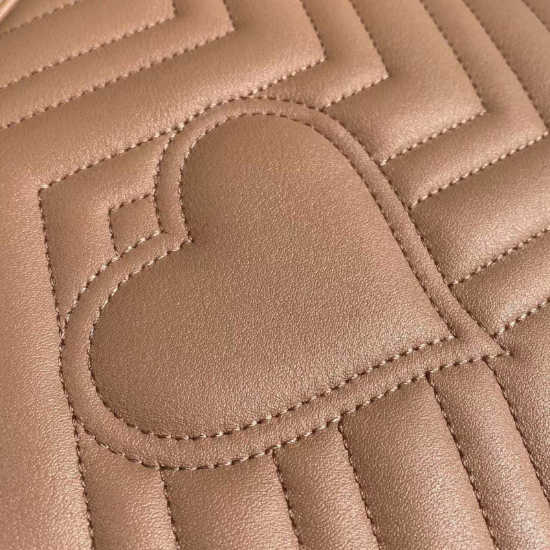 The small GG Marmont top handle bag has a softly structured shape and an oversized flap closure with Double G hardware. Made in matelassé chevron leather with a heart on the back.