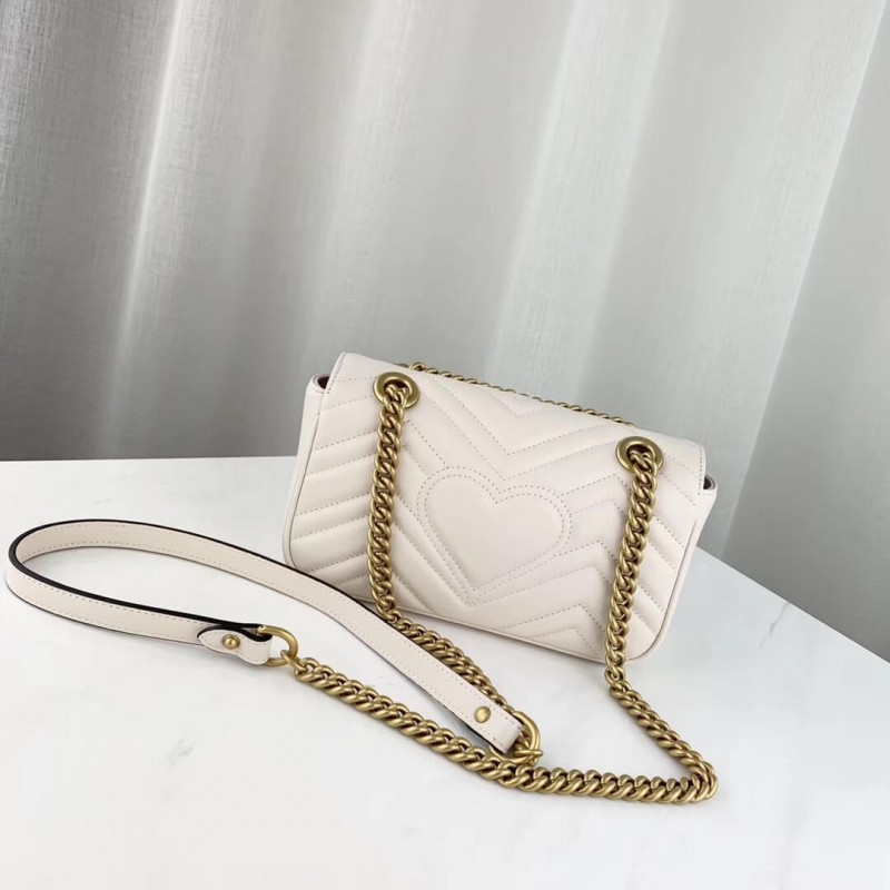 The mini GG Marmont chain shoulder bag has a softly structured shape and an oversized flap closure with Double G hardware. The sliding chain strap can be worn multiple ways, changing between a shoulder and a top handle bag. Made in matelassé chevron leather with a heart on the back.